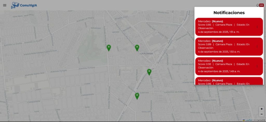 ComuVigIA es una plataforma de vigilancia comunitaria que utiliza inteligencia artificial para detectar conductas sospechosas — como merodeo prolongado, intentos de portonazo o ingreso forzado a viviendas— y enviar alertas en tiempo real a los equipos de seguridad municipal.